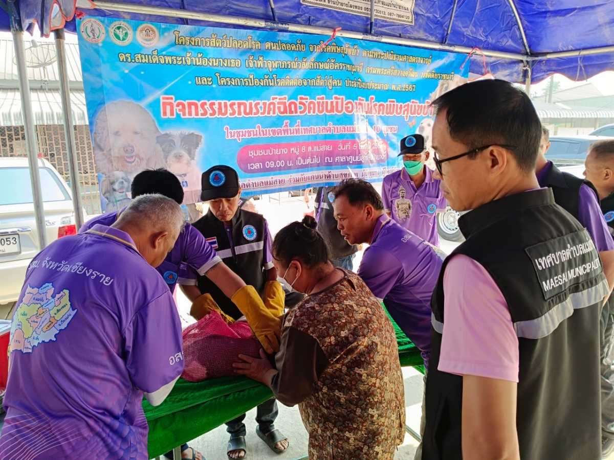 กองสาธารณสุขและสิ่งแวดล้อม เทศบาลตำบลแม่สาย ออกให้บริการฉีดวัคซีนป้องกันโรคพิษสุนัขบ้าในพื้นที่ชุมชนเขตเทศบาลตำบลแม่สาย ประจำปีงบประมาณ พ.ศ. 2567